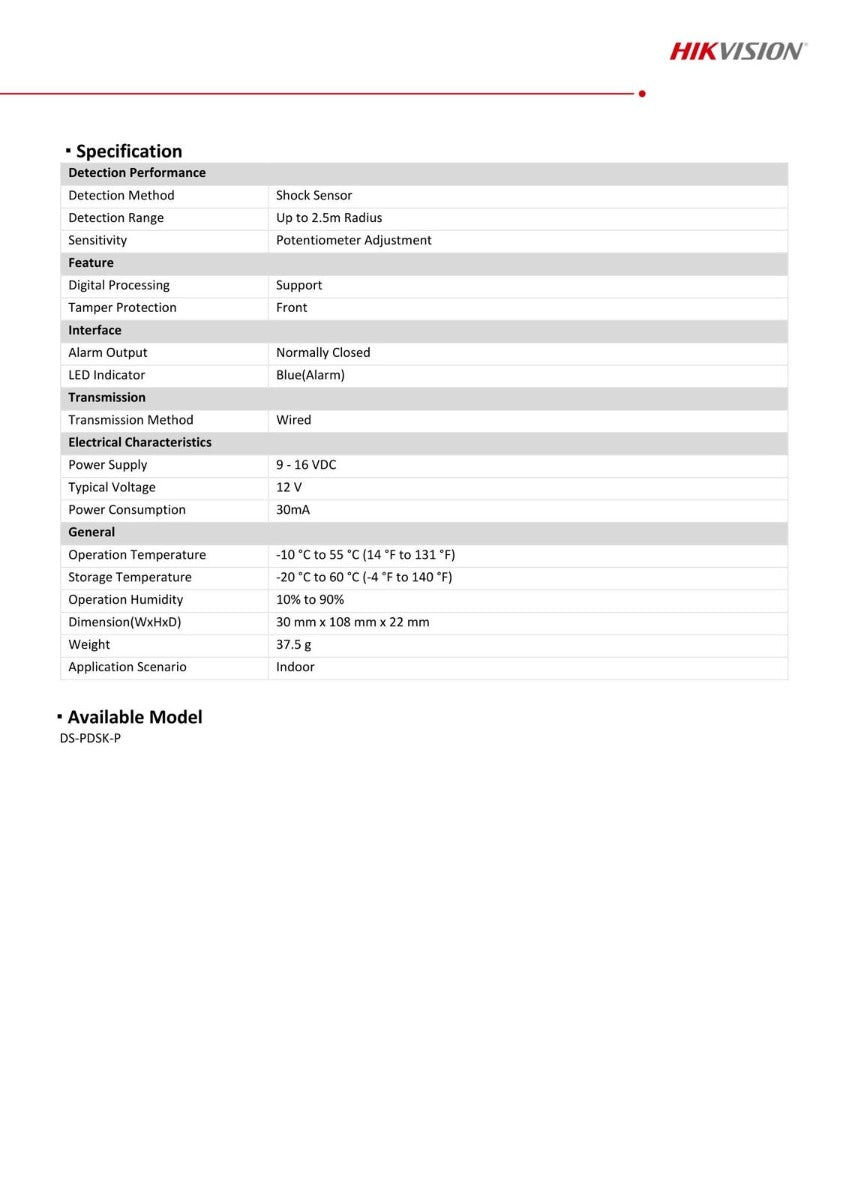 DS-PDSK-P Hikvision rilevatore wired cablato. Rilevatore di shock. Design sottile per una installazione poco invasiva, installazione facile. Protezione tamper, sensibilità regolabile.