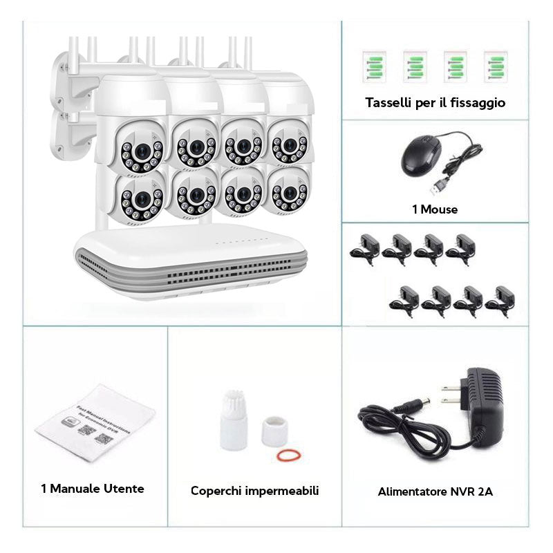 Sistema di videosorveglianza Wi-Fi con 8 telecamere motorizzate 360° visione a colori, 1 videoregistratore NVR, hard disk non incluso, alimentatori telecamere e alimentatore videoregistratore. Le telecamere offrono una visione in 5 MPX, resistenti all'acqua e polvere, provviste di tracciamento del movimento automatico e invio notifica tramite applicazione installata su smartphone (iCSee).