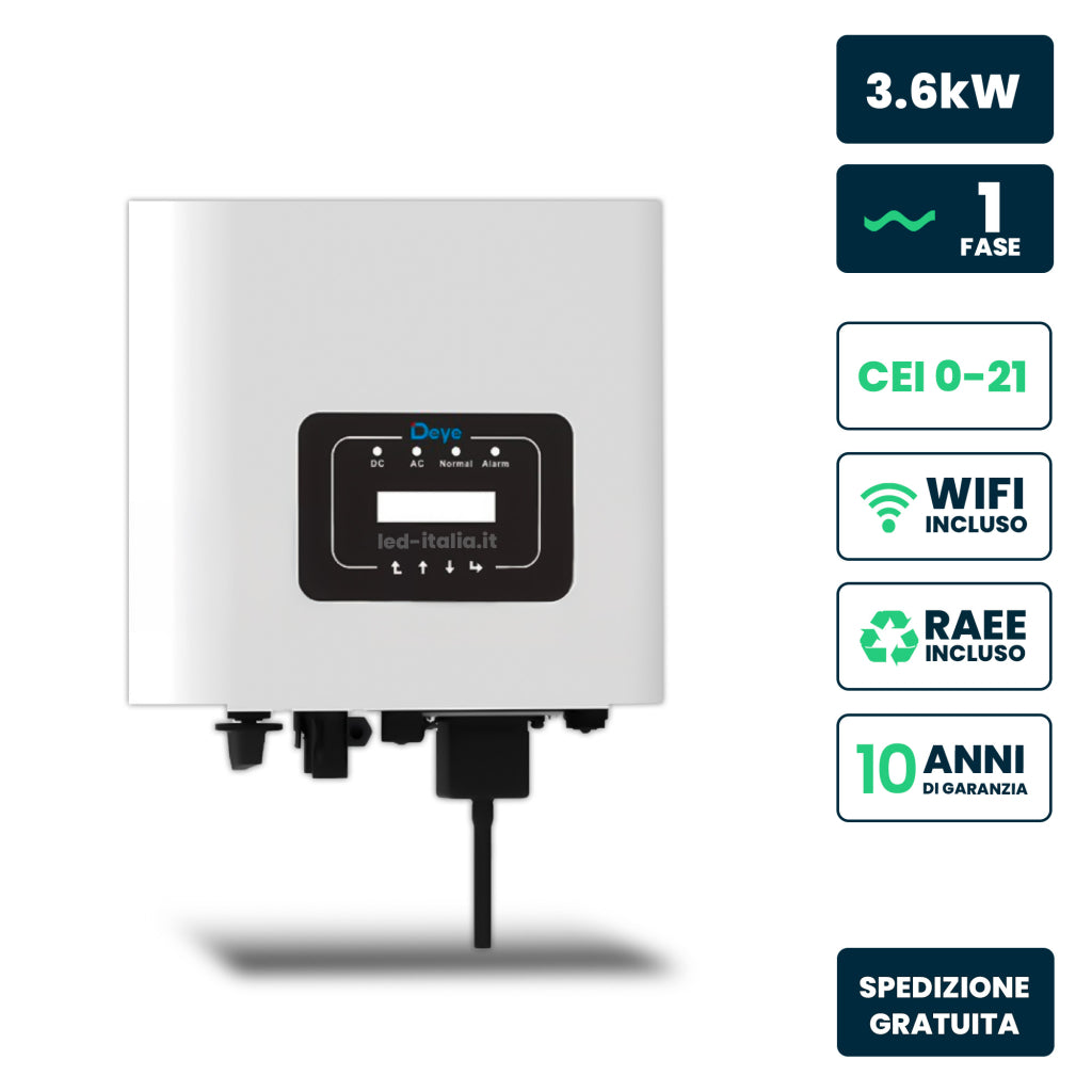 V-TAC Inverter Fotovoltaico di Rete On-Grid Deye Monofase 3.6kW, Singolo MPPT, CEI 0-21, Schermo LCD, WiFi Incluso, Garanzia 10 Anni IP65