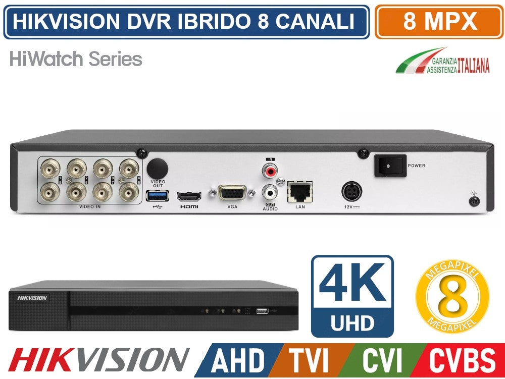 Hikvision 8-channel analog video recorder sku. HWD-7108MH-G4 Hiwatch series turbo Ultra HD 4K up to 8Mpx with 5IN1 hybrid technology multiple management CCTV standards: analog CVBS / HDCVI / HDTVI / AHD + IP @ 6Mpx. Ultra HD resolution in recording on all channels up to 8Mpx @ 8fps + 4 IP Camera. Thanks to the hybrid technology of the video recorder it is possible to update all old video surveillance systems, giving the possibility of installing cameras at higher resolutions using the traditional micro coaxial wiring used for the installation of analog CVBS cameras. Video recording is processed by a new video compression system identified as H.265 codec. This technology allows you to save up to 50% on storage space and data traffic consumption in remote viewing, compared to the previous H.264 compression.
