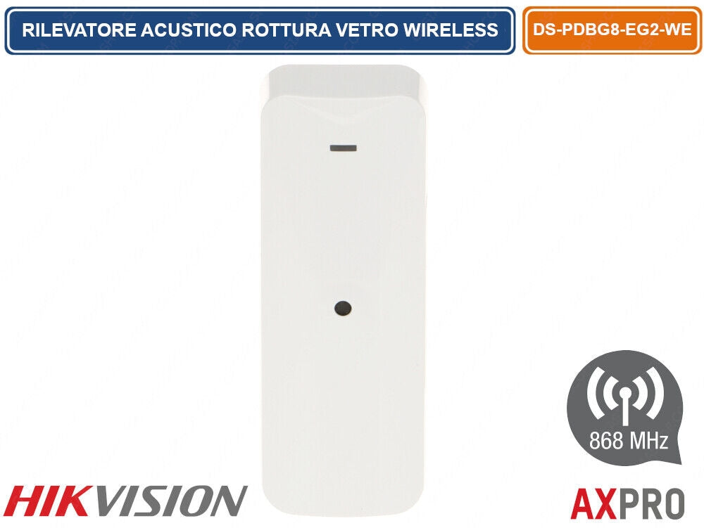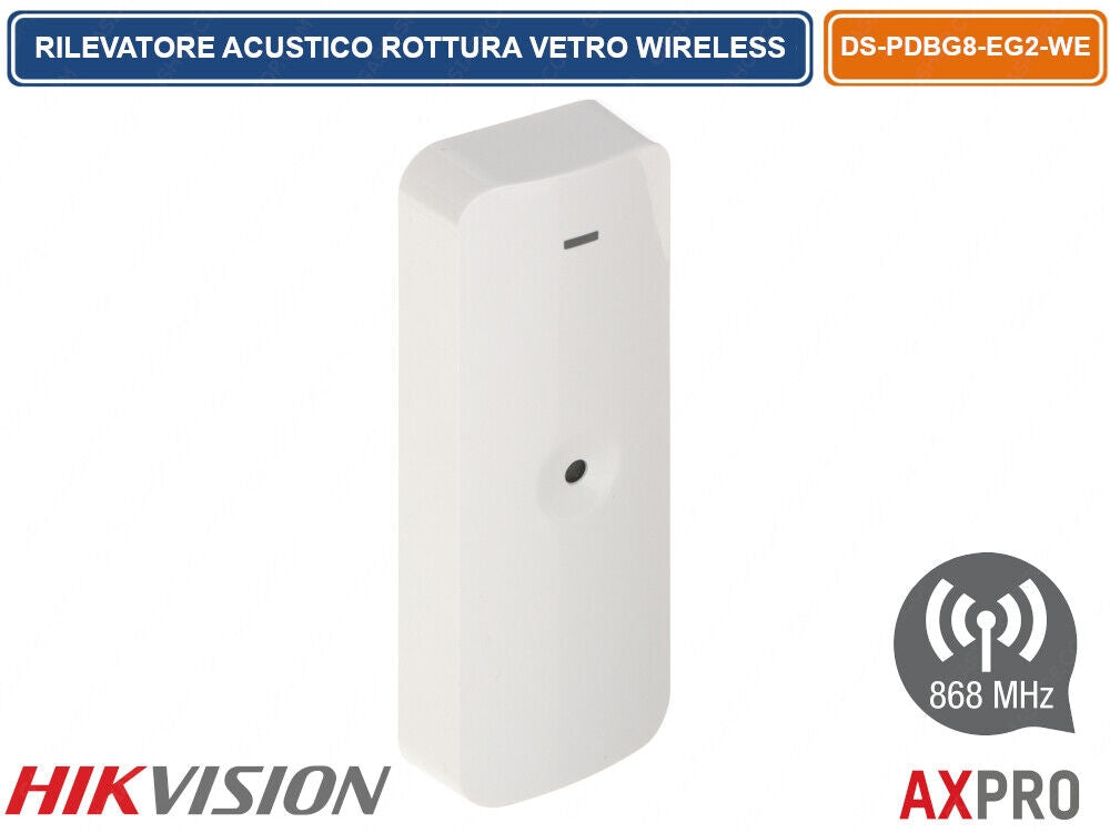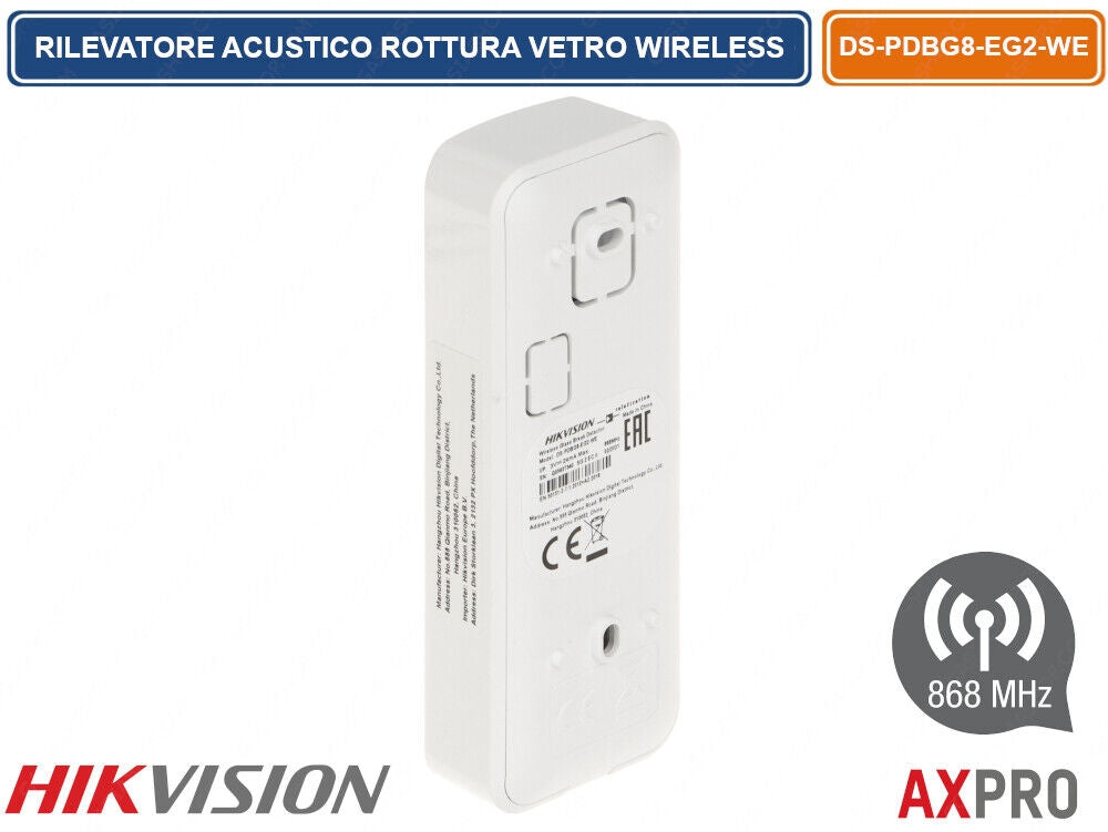 Hikvision Pyronix DS-PDBG8-EG2-WE Glass break sensor detector GLASS BREAK radio PIR Wireless 868MHz bidirectional indoor up to 1600m, range 8m/120°, suitable for different types of glass, Radio Signal Level LED, 128bit encoding, Lithium Battery (Included) 2 x BATT-CR123A. Installable on walls, ceilings, door and window frames and is fully compatible with Hikvision Wireless AXPRO and Pyronix ENF systems. Bidirectional wireless technology, this detector is the ideal choice for having a protected and safe home.