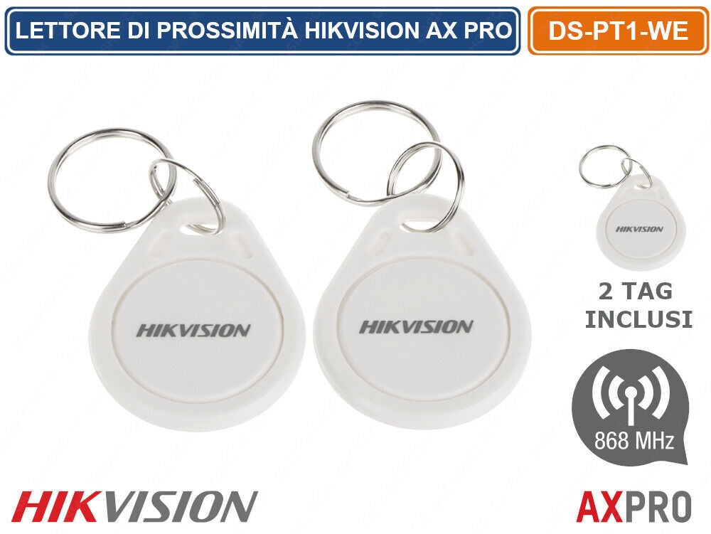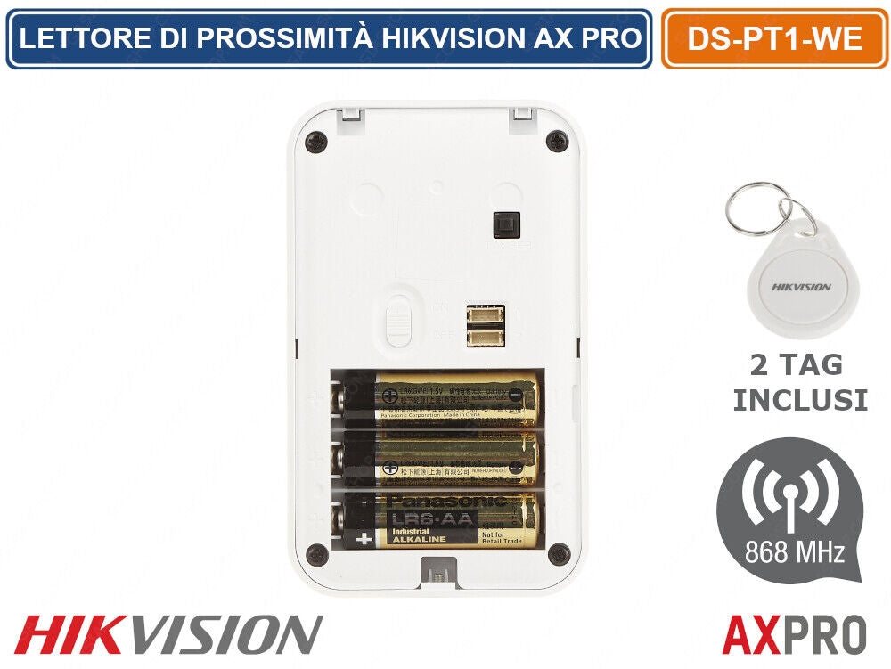 Hikvision AXPRO DS-PT1-WE Wireless Tag Reader Proximity Reader. 868 MHz two-way wireless communication. LED display, Tamper-proof front and back panel, Error confirmation arming process, more secure. This outdoor RFID proximity reader is fully compatible with 868MHz frequency alarm control panels. Useful for arming in "Stay" "Away" mode or disarming.