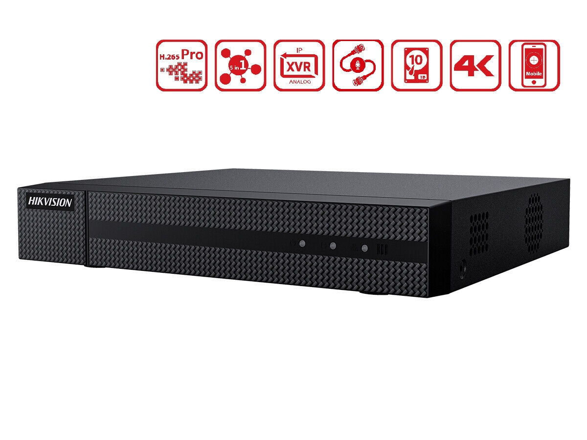 Hikvision 16-channel analog video recorder sku. HWD-6216MH-G4 Hiwatch series turbo Ultra HD 2K 4Mpx with 5IN1 hybrid technology multiple management CCTV standards: analog CVBS / HDCVI / HDTVI / AHD + IP @ 6Mpx. Ultra HD resolution in recording on all channels up to 4Mpx @ 8fps or 4M-N @ 15fps. Thanks to the hybrid technology of the video recorder it is possible to update all old video surveillance systems, giving the possibility of installing cameras at higher resolutions using the traditional micro coaxial wiring used for the installation of analog CVBS cameras. Video recording is processed by a new video compression system identified as H.265 Pro + codec. This technology allows you to save up to 50% on storage space and data traffic consumption in remote viewing, compared to the previous H.264 compression.