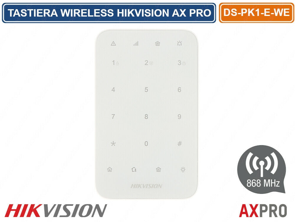 Hikvision AXPRO DS-PK1-E-WE 868MHz Wireless Keypad Touch tastiera allarme interna. Comunicazione wireless bidirezionale a 868MHz. Indicatori Led, Buzzer. Allarme antincendio, allarme panico e allarme medico One-Push. Configurabile da remoto tramite App. Utile per controllo allarme e operazioni varie. Segnalazione allarme mediante indicatori led e buzzer. Alimentazione 1.5 V DC e batterie 4xAA.