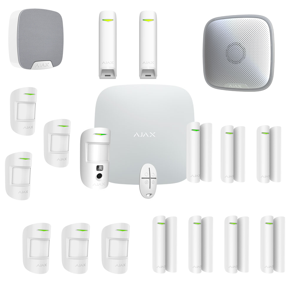 Il kit Ajax STARTERKIT-CAM 20293 è un sistema di allarme wireless composto da 4 dispositivi principali, in elegante colorazione bianca, progettato per offrire sicurezza avanzata, installazione semplificata e gestione intuitiva.