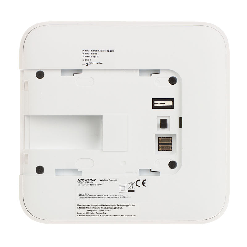 Hikvision AXPRO DS-PR1-WE Ripetitore del segnale wireless, con supporto alla frequenza 868Mhz - Comunicazione bidirezionale - 35h batteria. Facile da installare. Consente di amplificare il segnale e aumentare il raggio di azione dei dispositivi wireless Hikvision AX PRO. Compatibile con le centrali allarme Hikvision a frequenza 868MHz e permette l'aggiunta di 2 uscite radio (allarme, luce, camera, etc.).