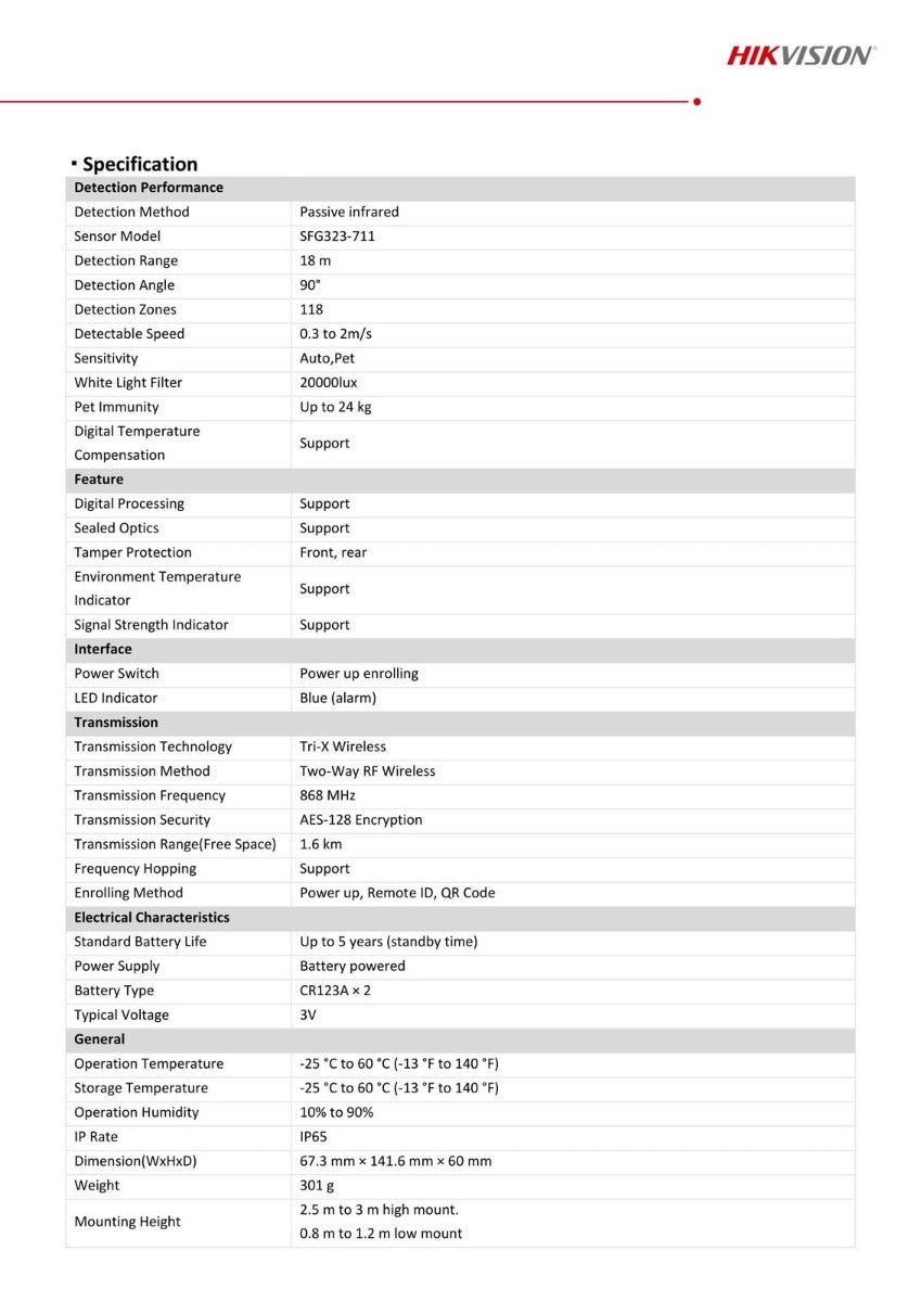 DS-PDP18-HM-WE(O-STD) Hikvision Rilevatore Allarme Sensore Wireless 868MHz Doppio PIR con rilevazione fino a 18 Metri e Immunità agli animali domestici (fino a 24KG). Tecnologia di trasmissione Tri-X con range fino a 1,6KM (spazio libero). Protezione IP65, Frequency Hopping, Indicatore LED di allarme e di potenza segnale, Alimentato a batteria 2xCR123A - Montaggio a parete.