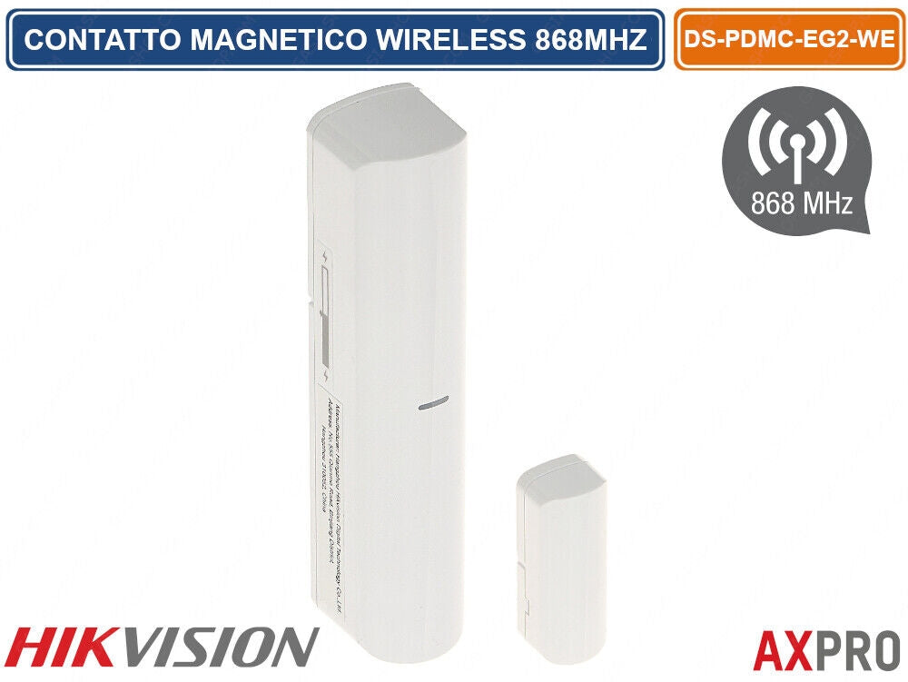DS-PDMC-EG2-WE AXPro Hikvision wireless contatto magnetico. Design sottile per una installazione poco invasiva, convigurabile da remoto via app, installazione facile. Tecnologia Tri-X Wireless, trasmissione two-way a 868MHz fino a 1.6Km.