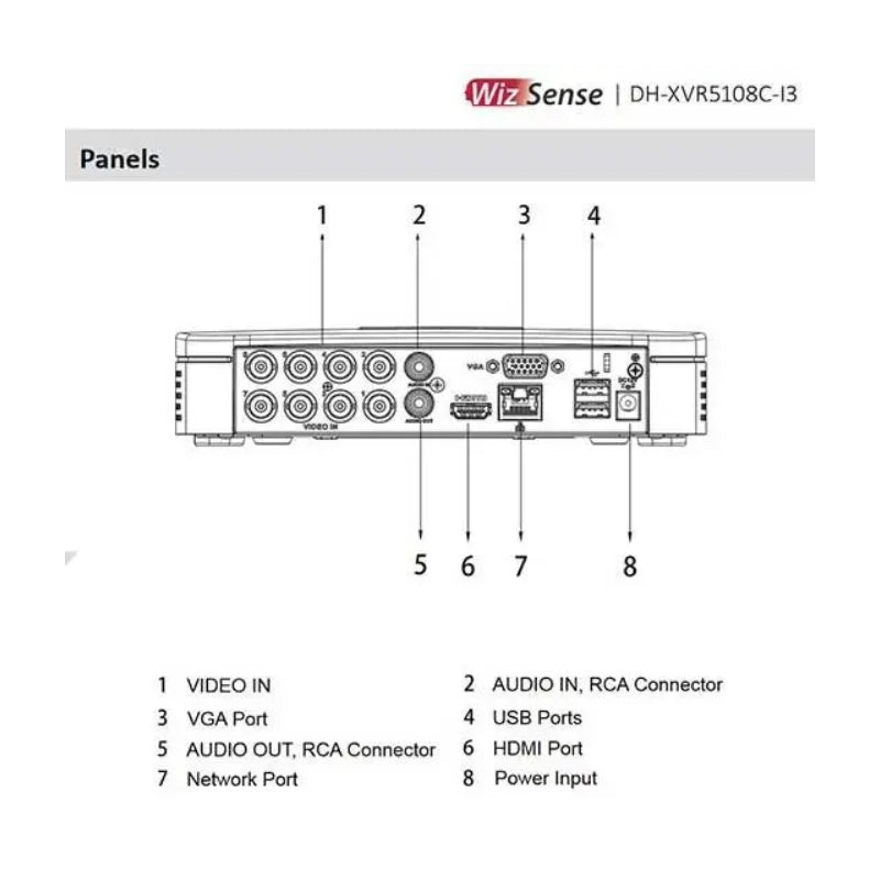 Videoregistraore XVR smart Dahua XVR5108C-I3 8Ch canali HDCVI Analogico 5IN1 gestione multipla standard CCTV(HDCVI/AHD/HDTVI/PAL/IP) con risoluzione fino a 5M-N(1440) e compressione video AI-Coding / H.265+. 1 HDMI, 1 VGA, 2 USB, RS485, supporto per 1 HDD SATA 3,5" Audio/Video (max 10TB.). Video Analisi (IVS) / Tecnologia AI - Intelligenza Artificiale / Riconoscimento facciale in tempo reale / Protezione Perimetro - SMD Plus / Smart Search / Collegamento a POS / Smart Fan / Coax. Audio. / Cloud P2P.
