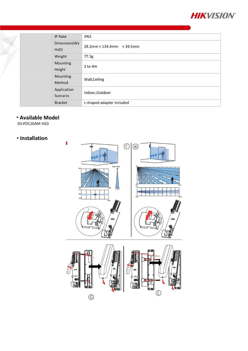 DS-PDC10AM-VG3 Hikvision Rilevatore filare PIR AM da esterno con lente tenda e anti mascheramento. Copertura IR fino a 10m con apertura di 5° orizzontali, Led di, Portata della microonda regolabile e 32 zone. Leva di selezione modalità di utilizzo (parete, soffitto). Staffa angolare per fissaggio a parete in dotazione. Alimentazione 9~16 Vcc – Max 22 mA. Dimensioni: 29,2x134,4x39,5 mm. Grado di protezione IP65.