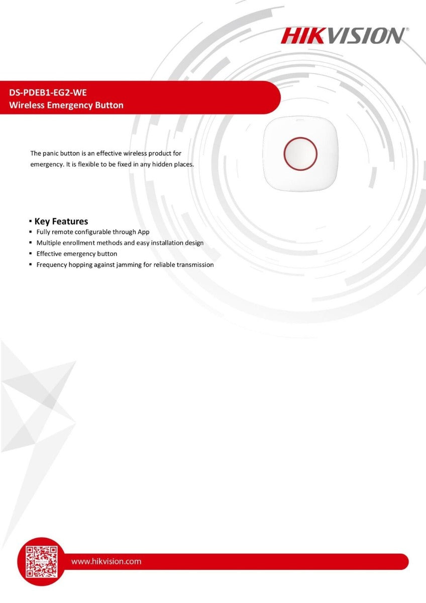 DS-PDEB1-EG2-WEAXPro Hikvision Pulsante di emergenza Wireless da interno, 868MHz. 1 Bottone, Indicatore Led Blu. Metodi di registrazione multipli. Salto di frequenza contro i disturbi per una trasmissione affidabile. Design di installazione semplice.
