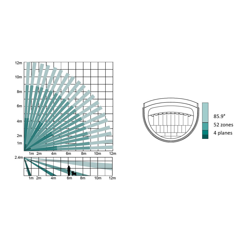 - Angolo di rilevamento / Gamma di rilevamento: Sensore PIR : 85.9 ° / 12 m, Rilevatore di rottura vetro : 120 ° / 8 m