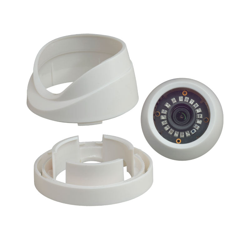 Corpo in PVC, per uso interno. Ha una sfera con tre assi di rotazione (3AXIS) che permettono la regolazione facile e precisa dell'angolo di visione, con installazione a parete o a soffitto.