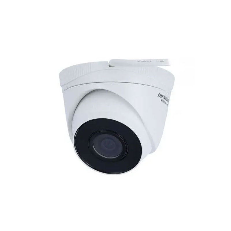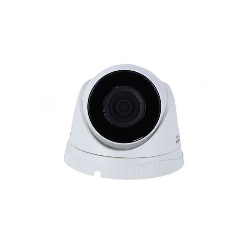 IP turret dome camera Hiwatch series Hikvision sku. HWI-T280H, 8.0 Megapixel UHD 4K resolution (3840 × 2160p), 4mm fixed lens (108° viewing angle) and PoE power technology. OSD menu with adjustable functions: ATW, AWB, AGC, BLC, Real WDR 120dB, 3D-DNR, brightness, sharpness, mirror. Very easy operation by Internet Explorer browser allows the users to convenient and remote support, and also remote management of the camera. Included camera software enables management and integrated monitoring of many network cameras. Turret dome CCTV camera with with metal and plastic structure in white color, can be installed indoors or outdoors (Waterproof IP67) with Infrared illuminator with REAL range up to 30M night vision. The dome shape makes the product installable on the ceiling or wall.