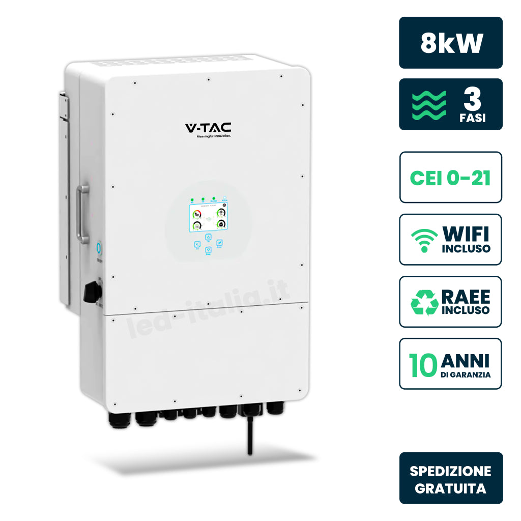 V-TAC Inverter Fotovoltaico Deye Trifase Ibrido On-Grid/Off-Grid 8kW, Doppio MPPT, CEI 0-21, Schermo LCD Touch, WiFi e TA Inclusi, Garanzia 10 Anni IP65