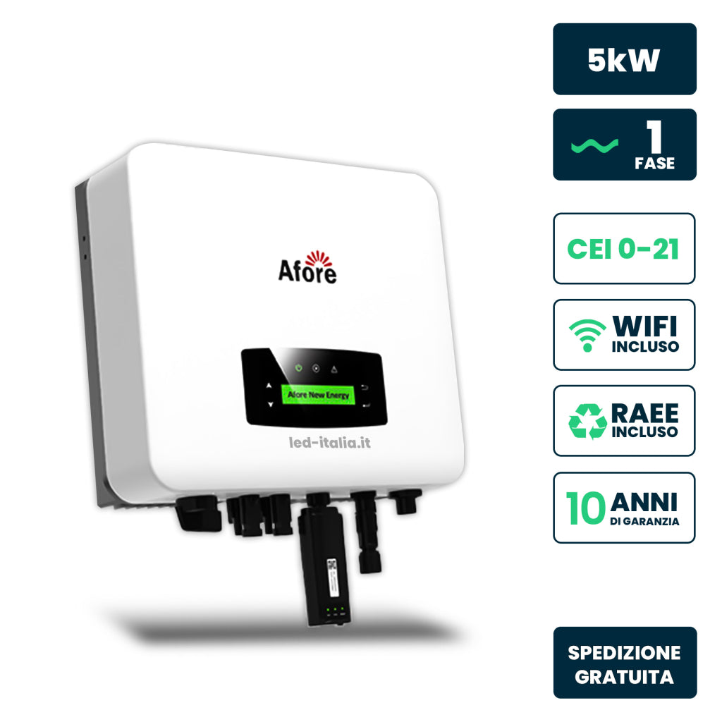 V-TAC Inverter Fotovoltaico di Rete On-Grid Afore Monofase 5kW, Doppio MPPT, CEI 0-21, WiFi Incluso, Garanzia 10 Anni IP65