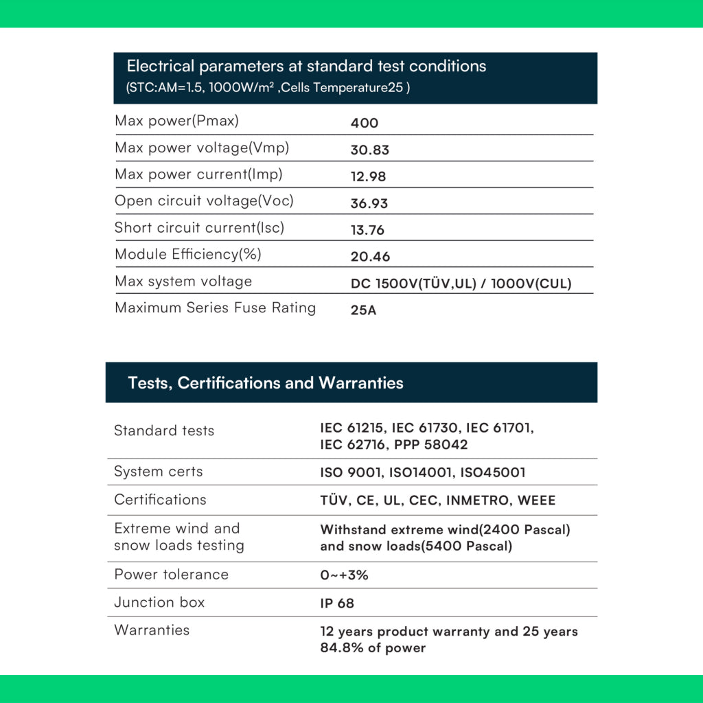 Certificato Tüv NORD. Scatola di giunzione IP67/IP68 a 3 diodi, 2 cavi di uscita di lunghezza 1,1 metro (110cm) 4mm² con connettore MC4, telaio in alluminio anodizzato, Vento/Neve: 2400Pa/5400Pa. Efficienza del modulo pari a 20.46%. 25 anni di garanzia sull'85% di producibilità, rendimento lineare.